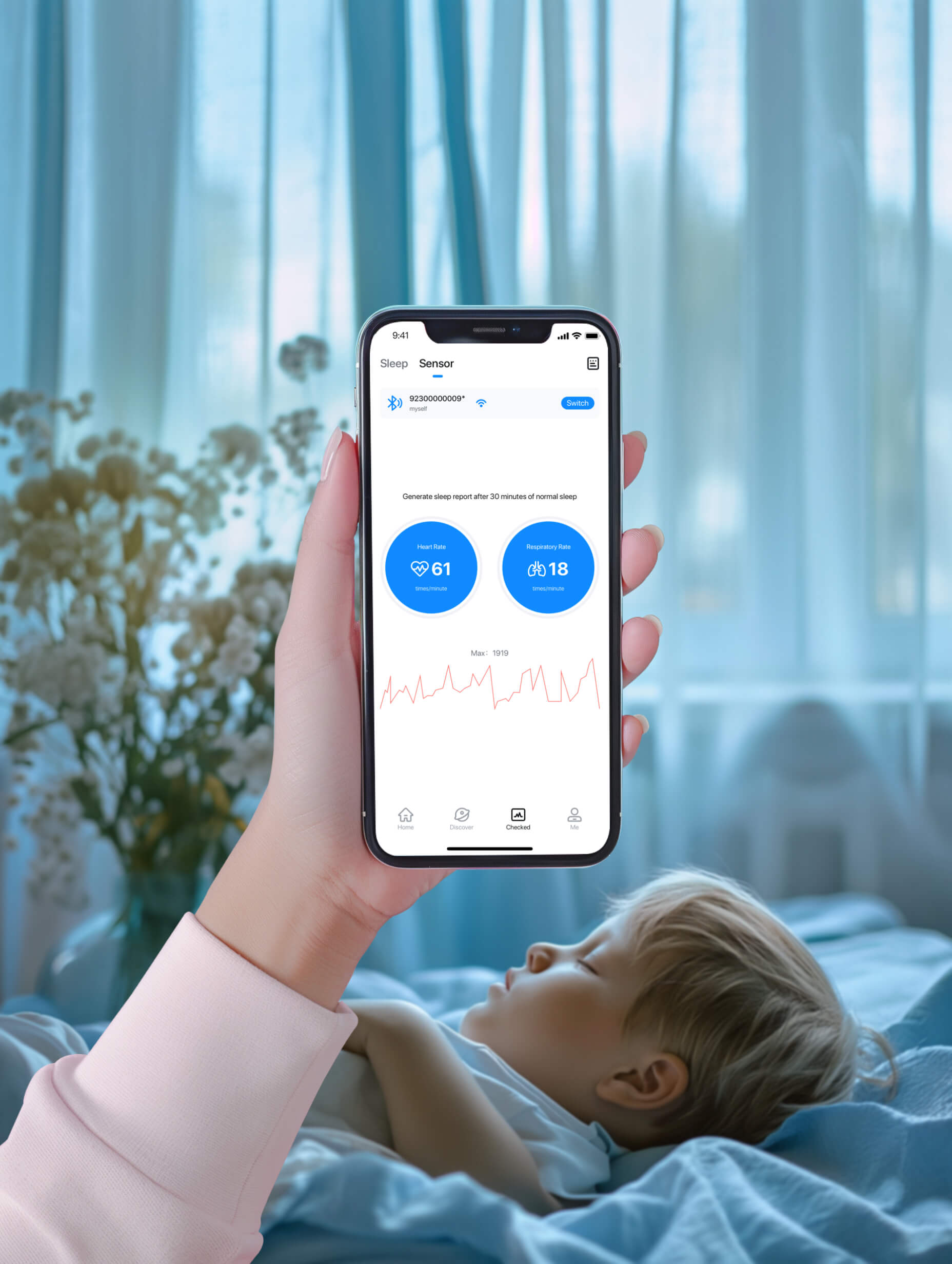The smart sleep recorder is a fully automatic, non-wearable children’s health monitoring product, consisting of a sensor and a controller. Non-contact detection of breathing rate, heart rate, body movements, sleep status, abnormal alarm, supports data access platform, sleep report analysis, etc. Supports docking with Plus1 Health Cloud Platform and Plus1 Health APP.